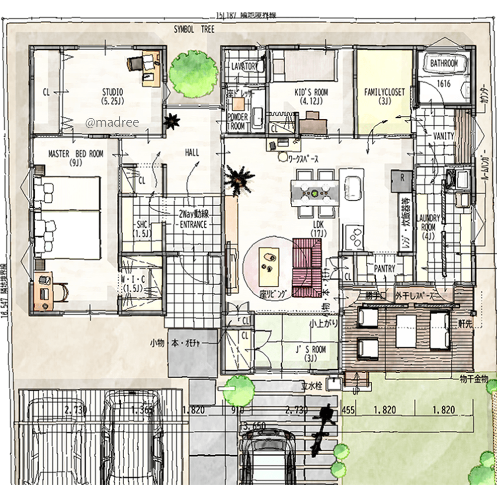 全国の建築家から間取りが集まるmadree(マドリー)で集まった33坪、3LDKの間取りです。外とつながるLDKやアウトドアリビングが特徴の注文住宅の間取りです。