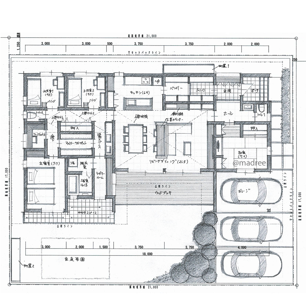 全国の建築家から間取りが集まるmadree(マドリー)で集まった45坪、4LDKの間取りです。外とつながるLDKやアウトドアリビングが特徴の注文住宅の間取りです。
