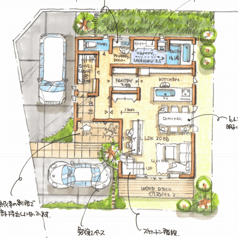 全国の建築家から間取りが集まるmadree(マドリー)で集まった49坪、4LDKの間取りです。外とつながるLDKやアウトドアリビングが特徴の注文住宅の間取りです。