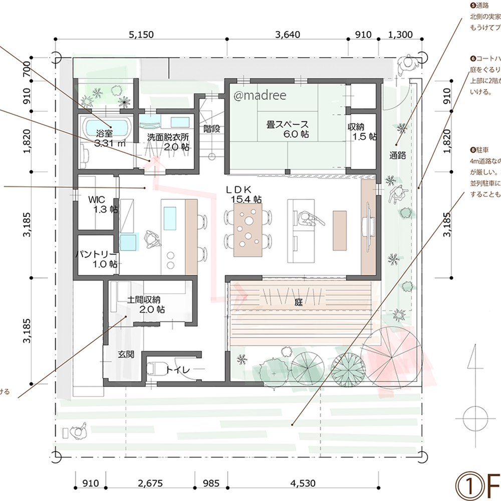 全国の建築家から間取りが集まるmadree(マドリー)で集まった35坪、3LDKの間取りです。外とつながるLDKやアウトドアリビングが特徴の注文住宅の間取りです。