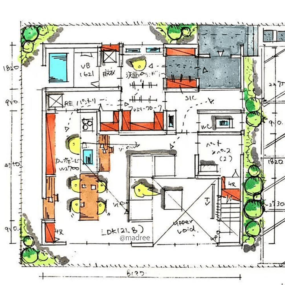 全国の建築家から間取りが集まるmadree(マドリー)で集まった37坪、2LDKの間取りです。外とつながるLDKやアウトドアリビングが特徴の注文住宅の間取りです。