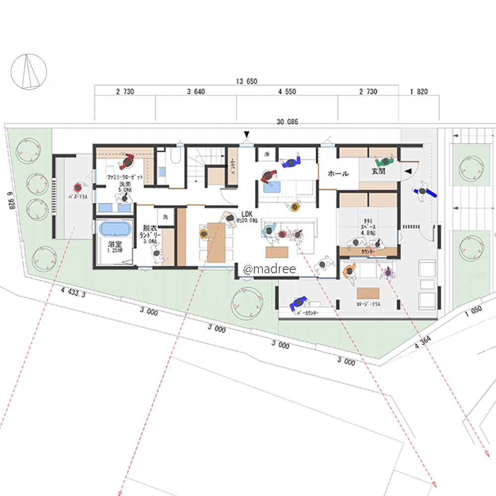 全国の建築家から間取りが集まるmadree(マドリー)で集まった40坪、3LDKの間取りです。外とつながるLDKやアウトドアリビングが特徴の注文住宅の間取りです。