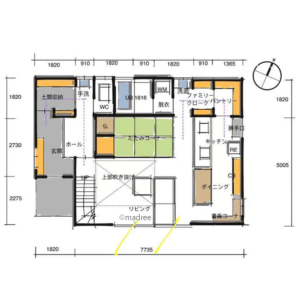 全国の建築家から間取りが集まるmadree(マドリー)で集まった38坪、2LDKの間取りです。リビング吹抜や広く感じるLDKが特徴の注文住宅の間取りです。