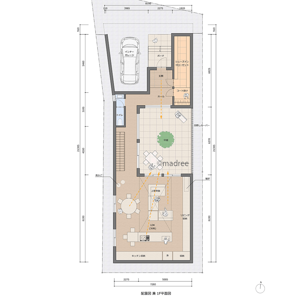 中庭へと繋がるゆったり空間、建物中央から光届ける縦長コートハウスの間取りアイデア