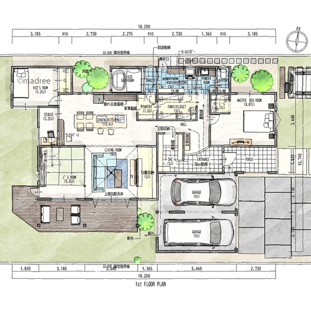 ウォークスルーのファミクロと水廻りで朝もラクラク、緑に癒される回遊動線の平屋の間取りアイデア