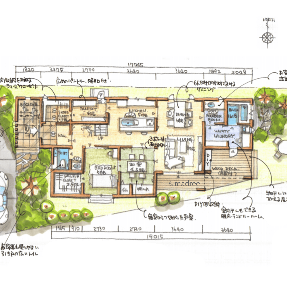 全国の建築家から間取りが集まるmadree(マドリー)で集まった44坪、4LDKの間取りです。外とつながるLDKや広く感じるLDKが特徴の注文住宅の間取りです。