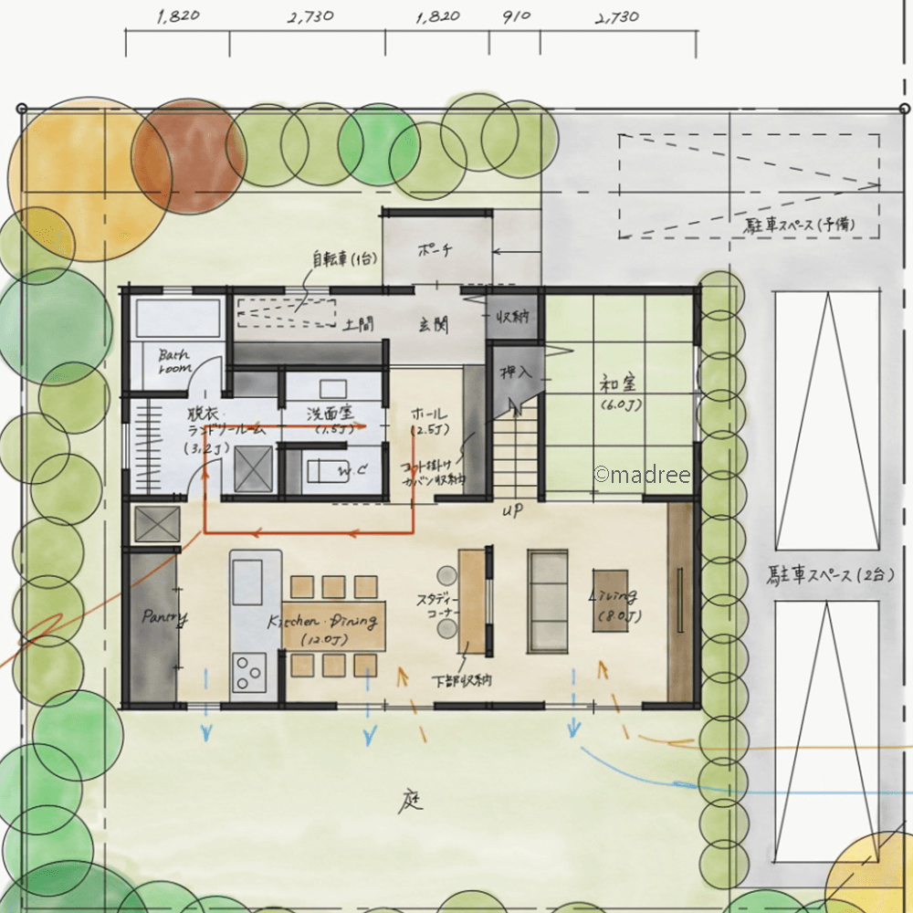 全国の建築家から間取りが集まるmadree(マドリー)で集まった44坪、5LDKの間取りです。外とつながるLDKや広く感じるLDKが特徴の注文住宅の間取りです。