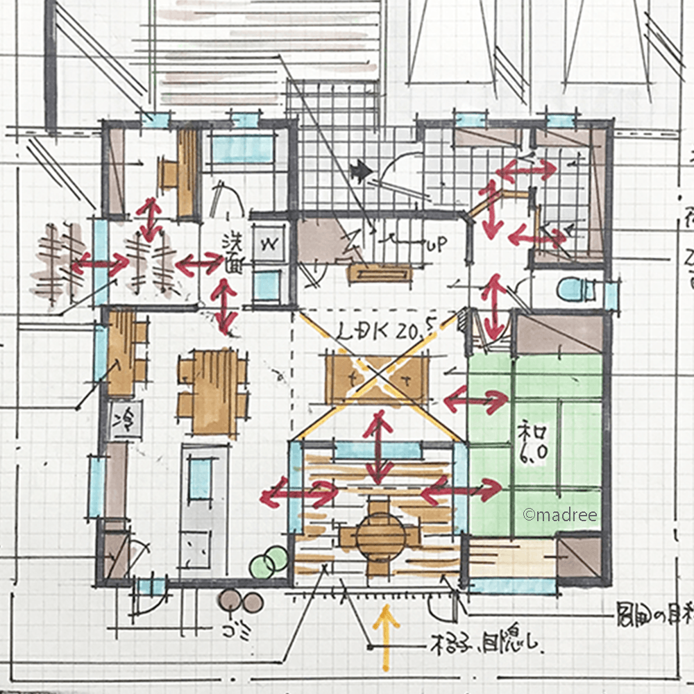 全国の建築家から間取りが集まるmadree(マドリー)で集まった38坪、3LDKの間取りです。外とつながるLDKやアウトドアリビングが特徴の注文住宅の間取りです。