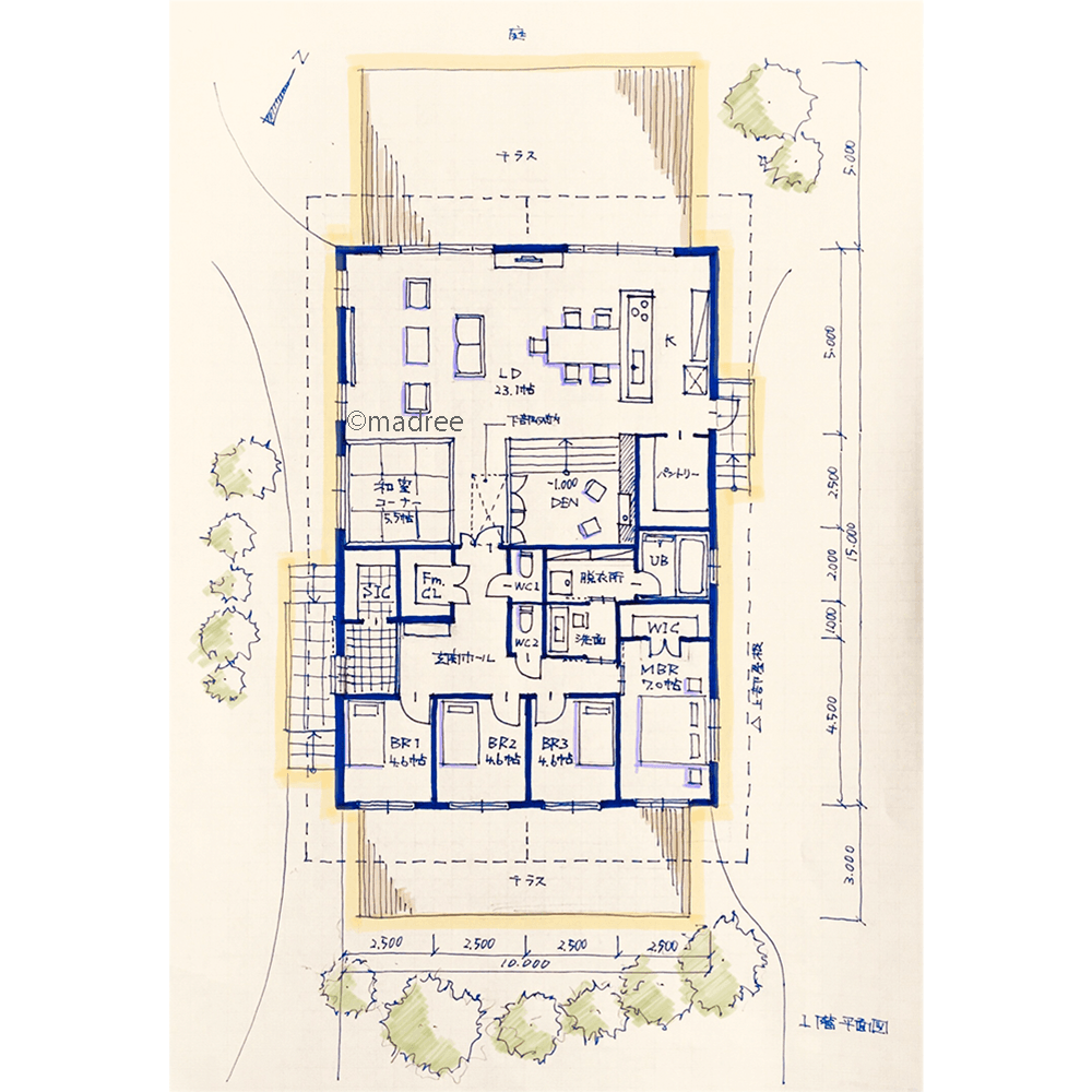 全国の建築家から間取りが集まるmadree(マドリー)で集まった45坪、4LDKの間取りです。外とつながるLDKやアウトドアリビングが特徴の注文住宅の間取りです。
