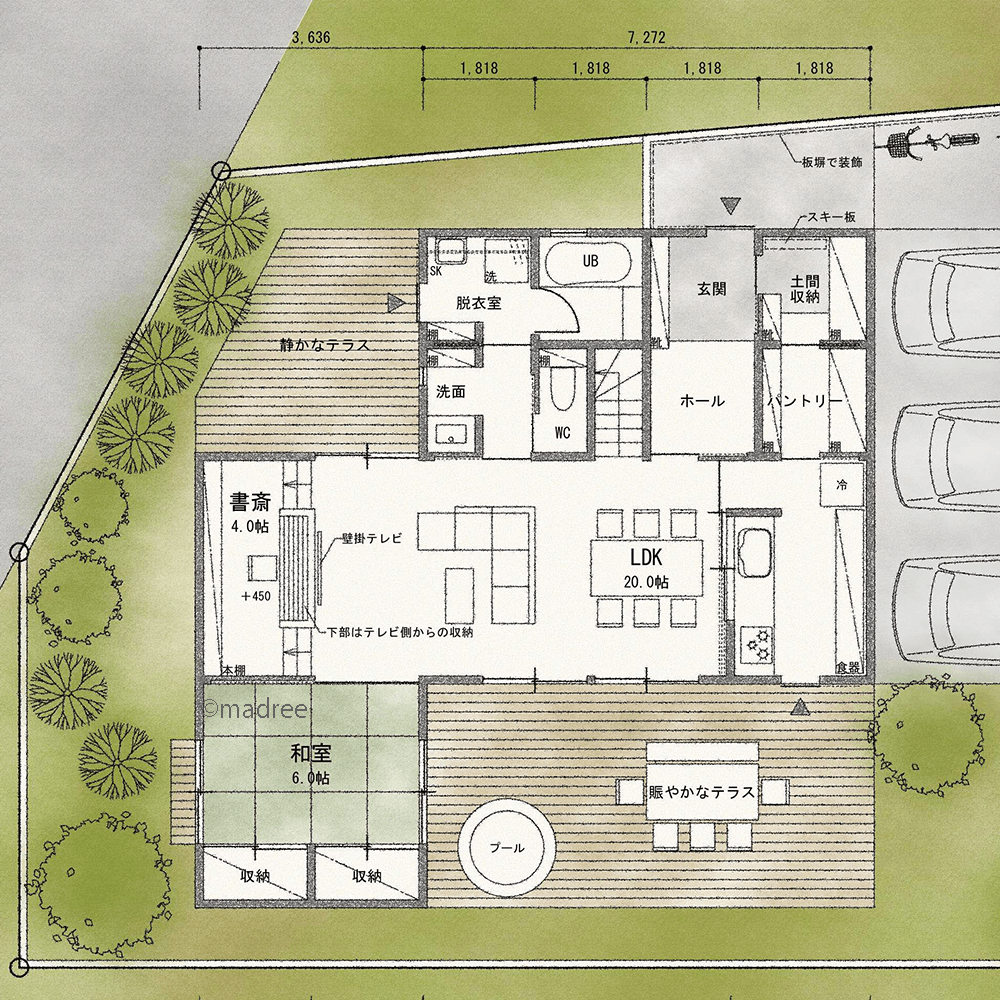 全国の建築家から間取りが集まるmadree(マドリー)で集まった40坪、4LDKの間取りです。外とつながるLDKやアウトドアリビングが特徴の注文住宅の間取りです。
