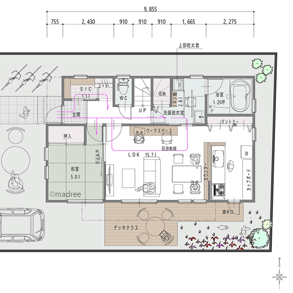 全国の建築家から間取りが集まるmadree(マドリー)で集まった27坪〜30坪、5LDKの間取りです。外とつながるLDKやアウトドアリビングが特徴の注文住宅の間取りです。