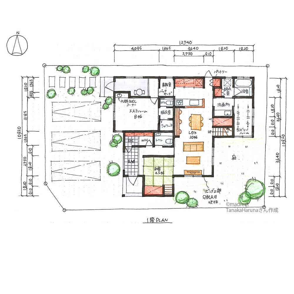 全国の建築家から間取りが集まるmadree(マドリー)で集まった42坪、2LDKの間取りです。外とつながるLDKやリビング中心の動線が特徴の注文住宅の間取りです。