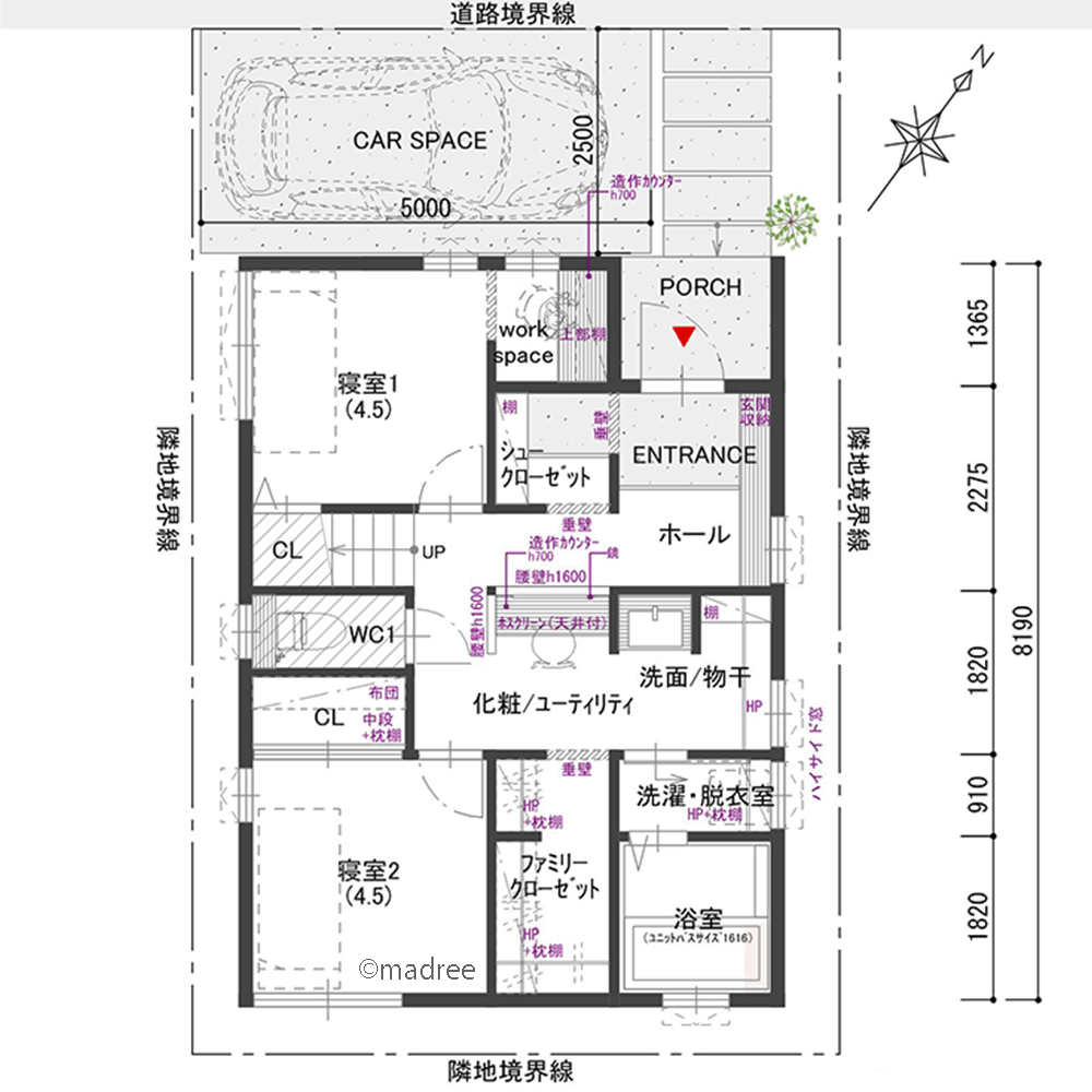 ・洗面脇にファミリークローゼットを設ける事で、短い距離での洗濯動線が成立します。