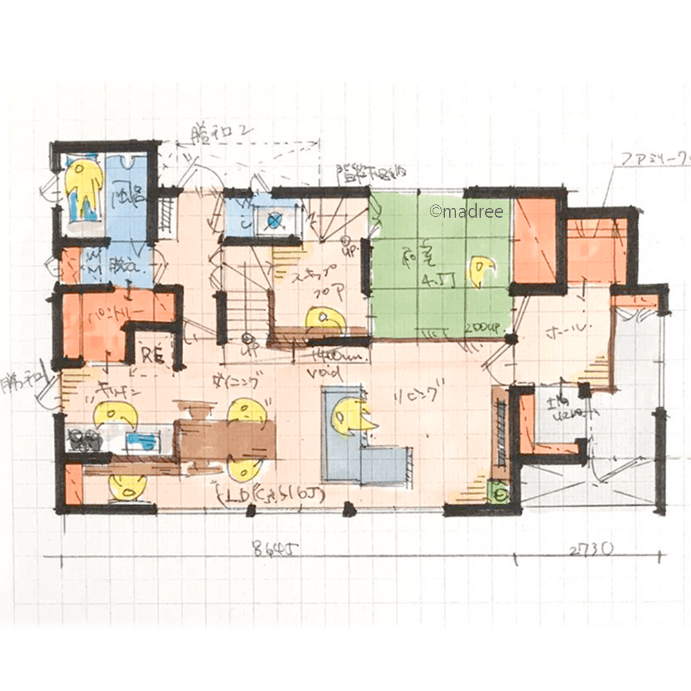 全国の建築家から間取りが集まるmadree(マドリー)で集まった35坪、2LDKの間取りです。広く感じるLDKやリビング一体の畳が特徴の注文住宅の間取りです。