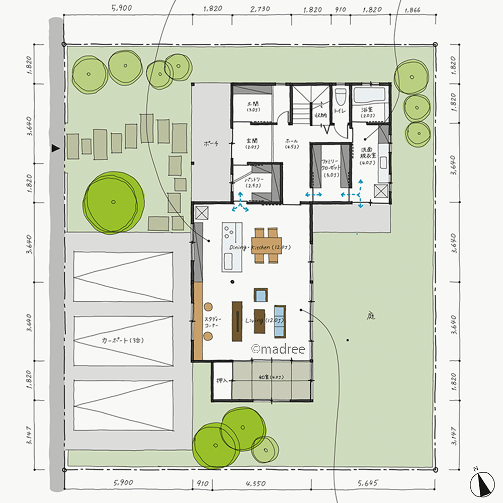 [39坪 3LDK] 庭とつながるダイナミックなリビングが主役、機能別に空間分けた快適動線の家の間取り