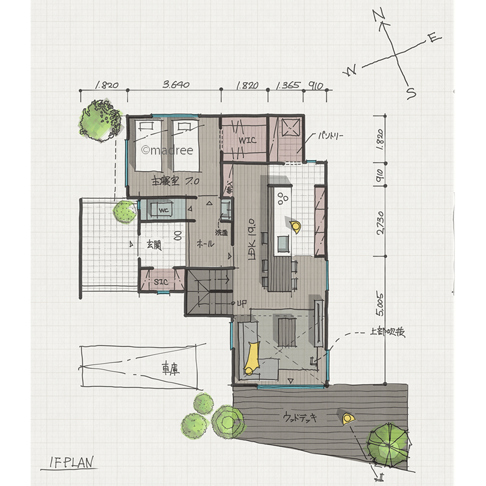 ・LDKと繋がる大型のウッドデッキを設けました。リビングと開放的な繋がりと広がりを感じられます。