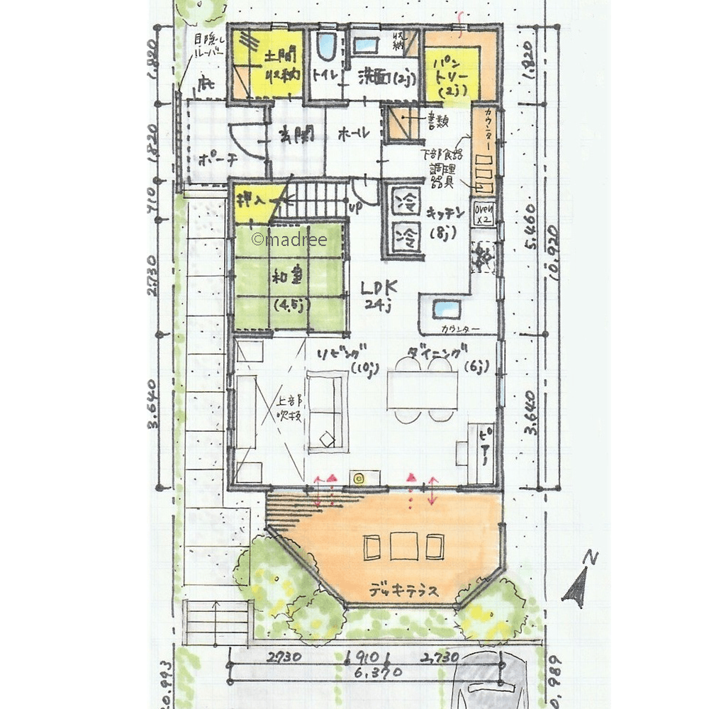 全国の建築家から間取りが集まるmadree(マドリー)で集まった38坪、4LDKの間取りです。外とつながるLDKやアウトドアリビングが特徴の注文住宅の間取りです。