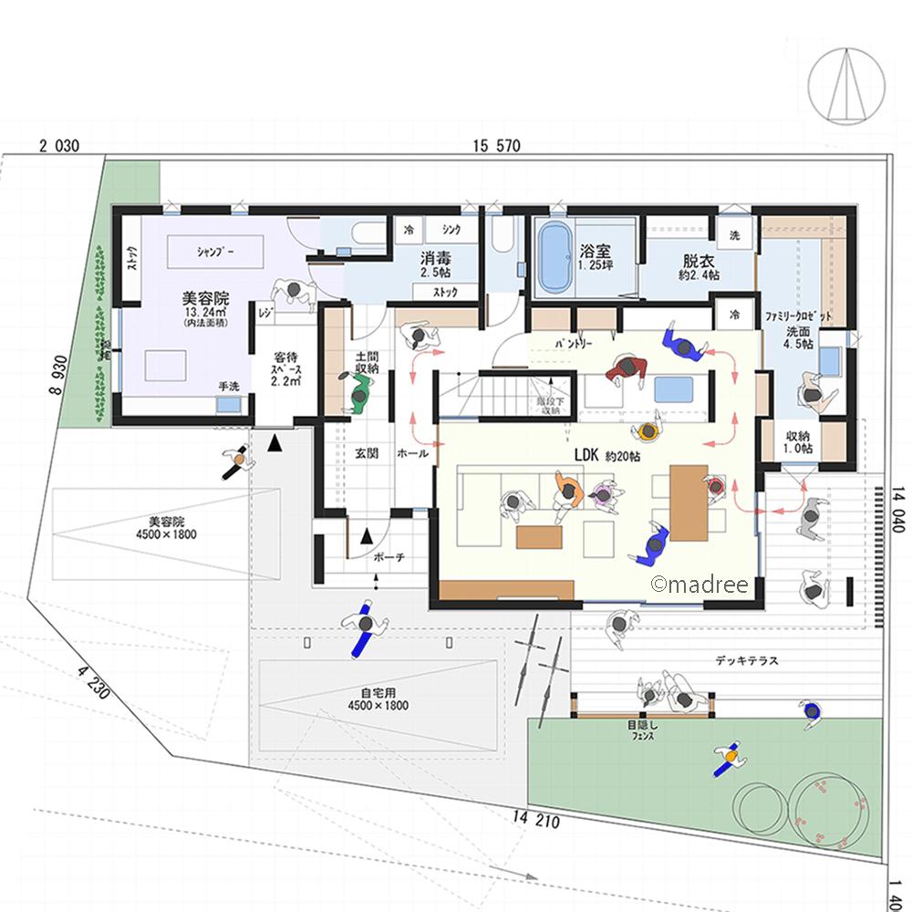 [41坪 2LDK] 3WAYの通り土間でプライバシーを守る、家族がのびのび過ごせる美容室併設の家の間取り