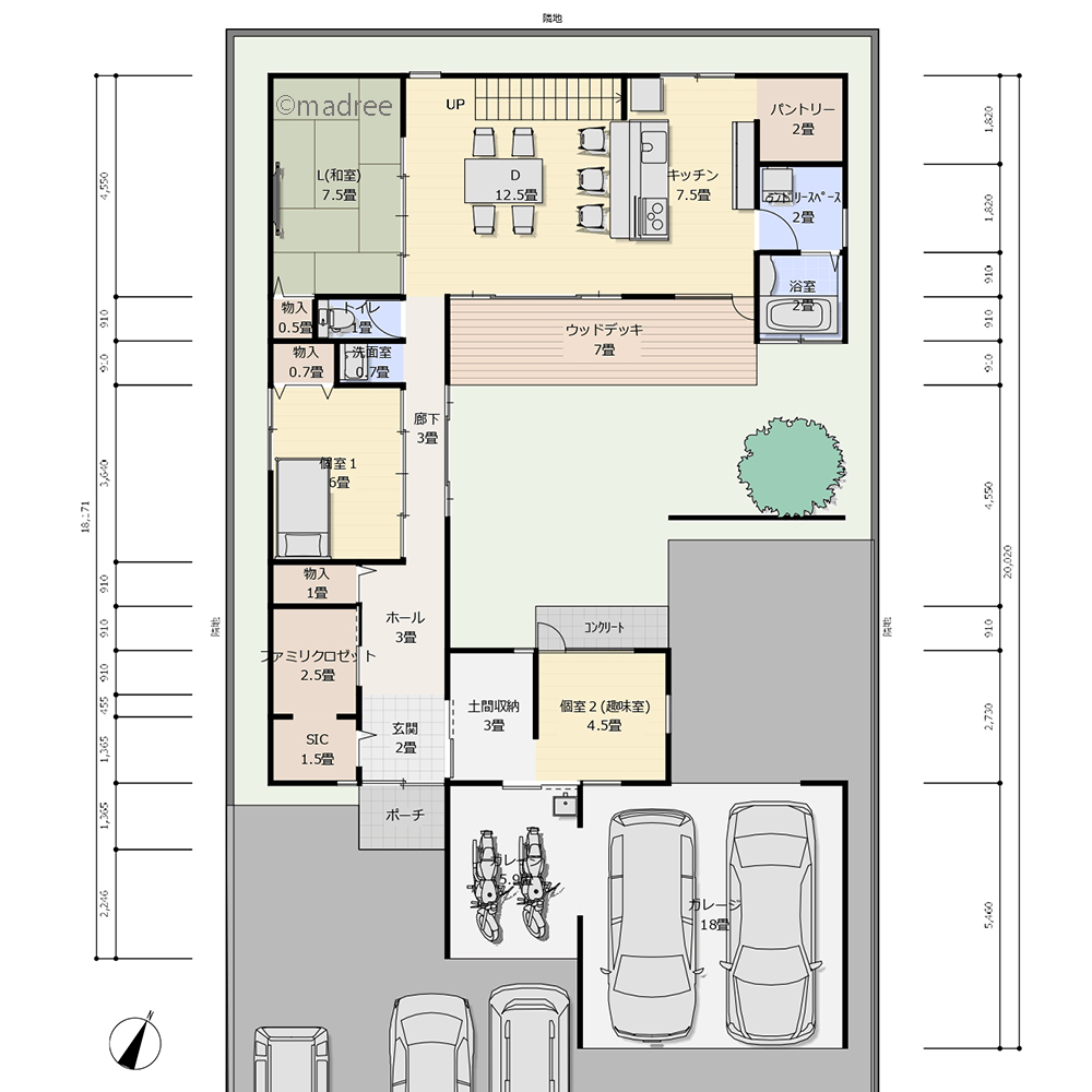 全国の建築家から間取りが集まるmadree(マドリー)で集まった59坪、5LDKの間取りです。外とつながるLDKやアウトドアリビングが特徴の注文住宅の間取りです。