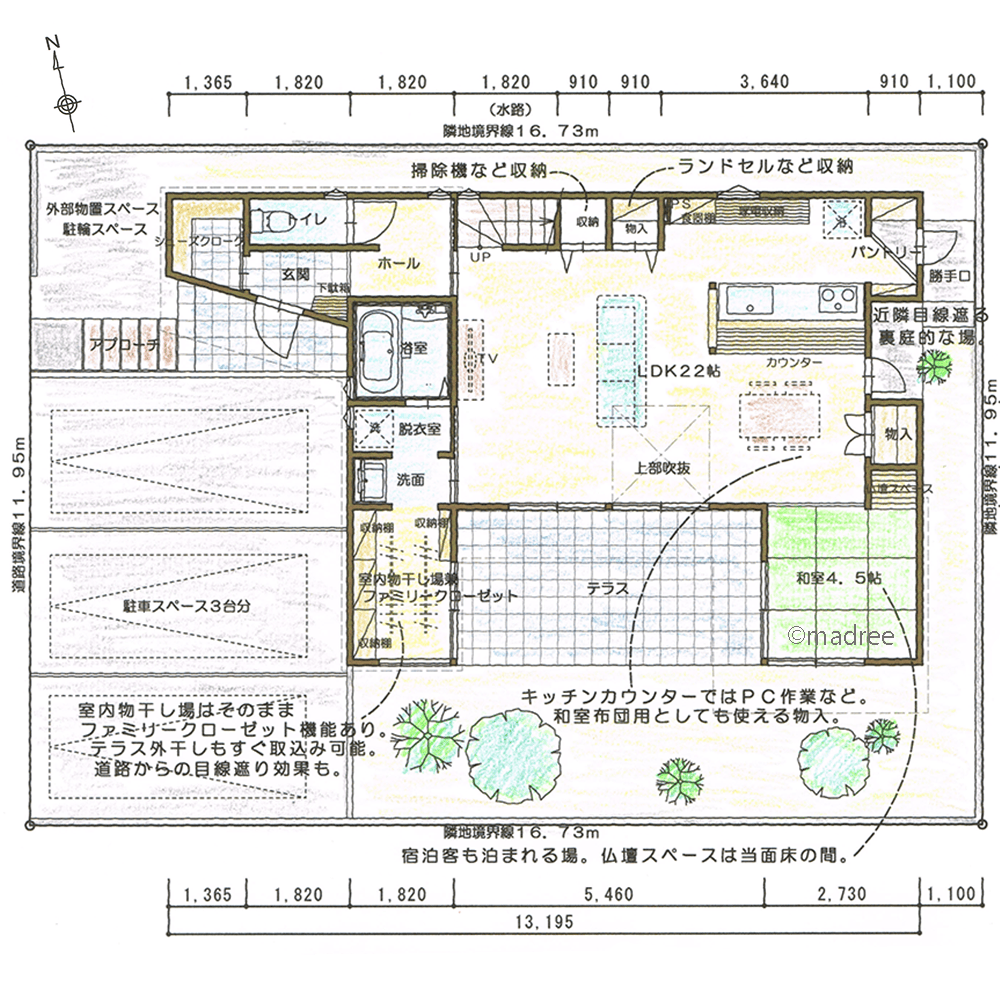 ・駐車スペースは3台で、袋小路でもバックで車庫入れできる配列としました。