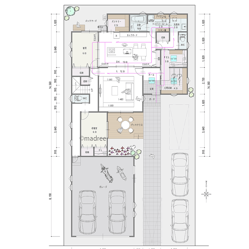 全国の建築家から間取りが集まるmadree(マドリー)で集まった52坪、4LDKの間取りです。外とつながるLDKやアウトドアリビングが特徴の注文住宅の間取りです。