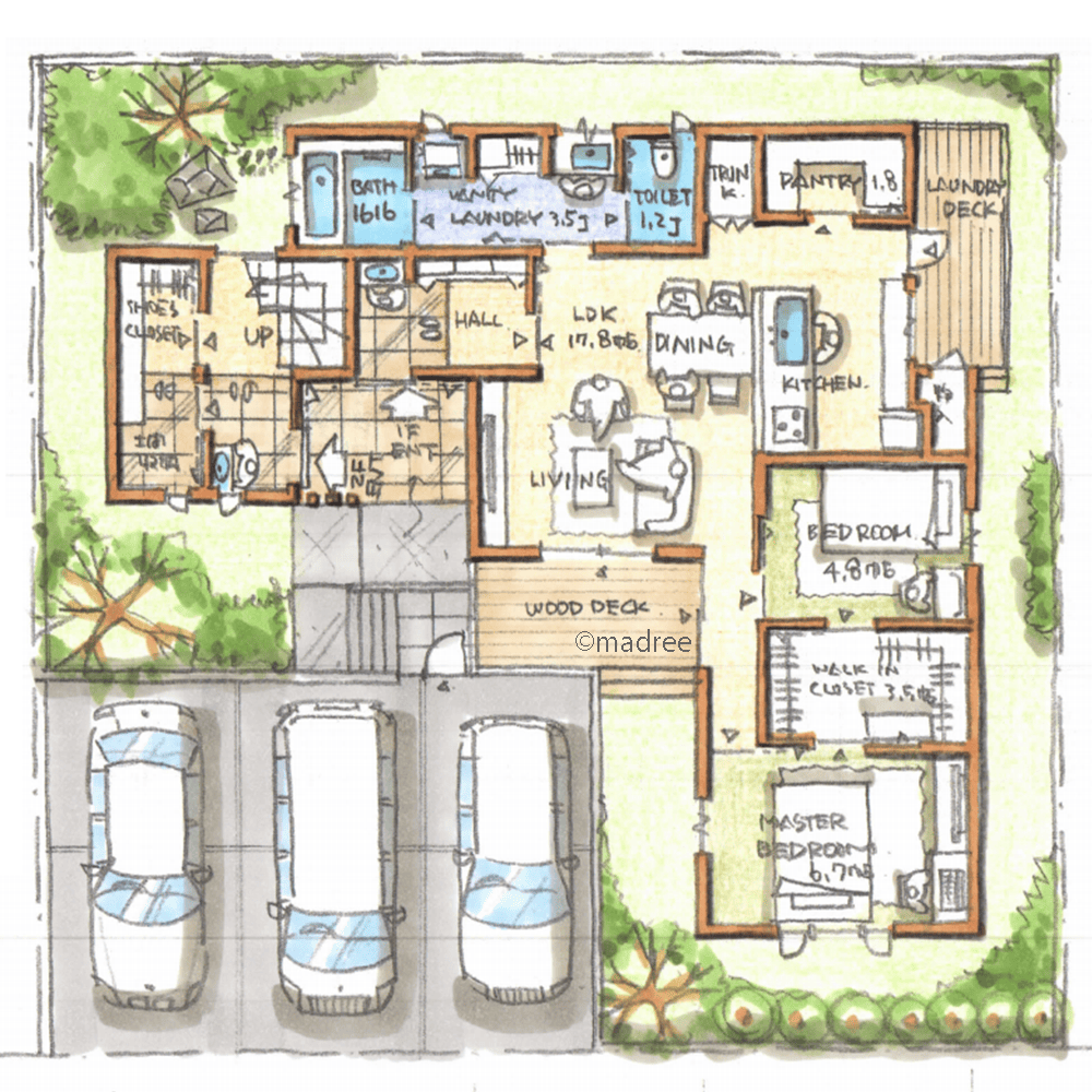 全国の建築家から間取りが集まるmadree(マドリー)で集まった56坪、2LDKの間取りです。外とつながるLDKやアウトドアリビングが特徴の注文住宅の間取りです。