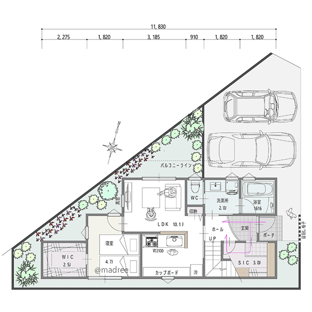 [39坪 1LDK] キッチンを中心にぐるっと回遊家事、変形地を生かした明るい二世帯住宅の間取り