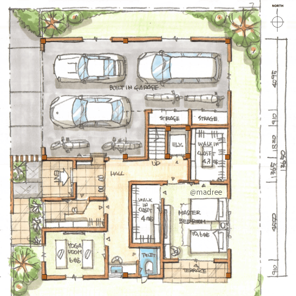 全国の建築家から間取りが集まるmadree(マドリー)で集まった60坪、3LDKの間取りです。外とつながるLDKやアウトドアリビングが特徴の注文住宅の間取りです。
