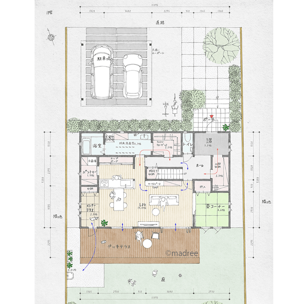 全国の建築家から間取りが集まるmadree(マドリー)で集まった40坪、4LDKの間取りです。外とつながるLDKやアウトドアリビングが特徴の注文住宅の間取りです。