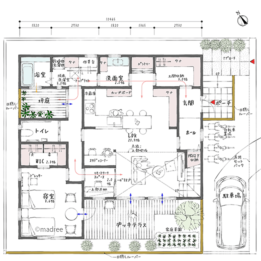 全国の建築家から間取りが集まるmadree(マドリー)で集まった45坪、4LDKの間取りです。外とつながるLDKやアウトドアリビングが特徴の注文住宅の間取りです。