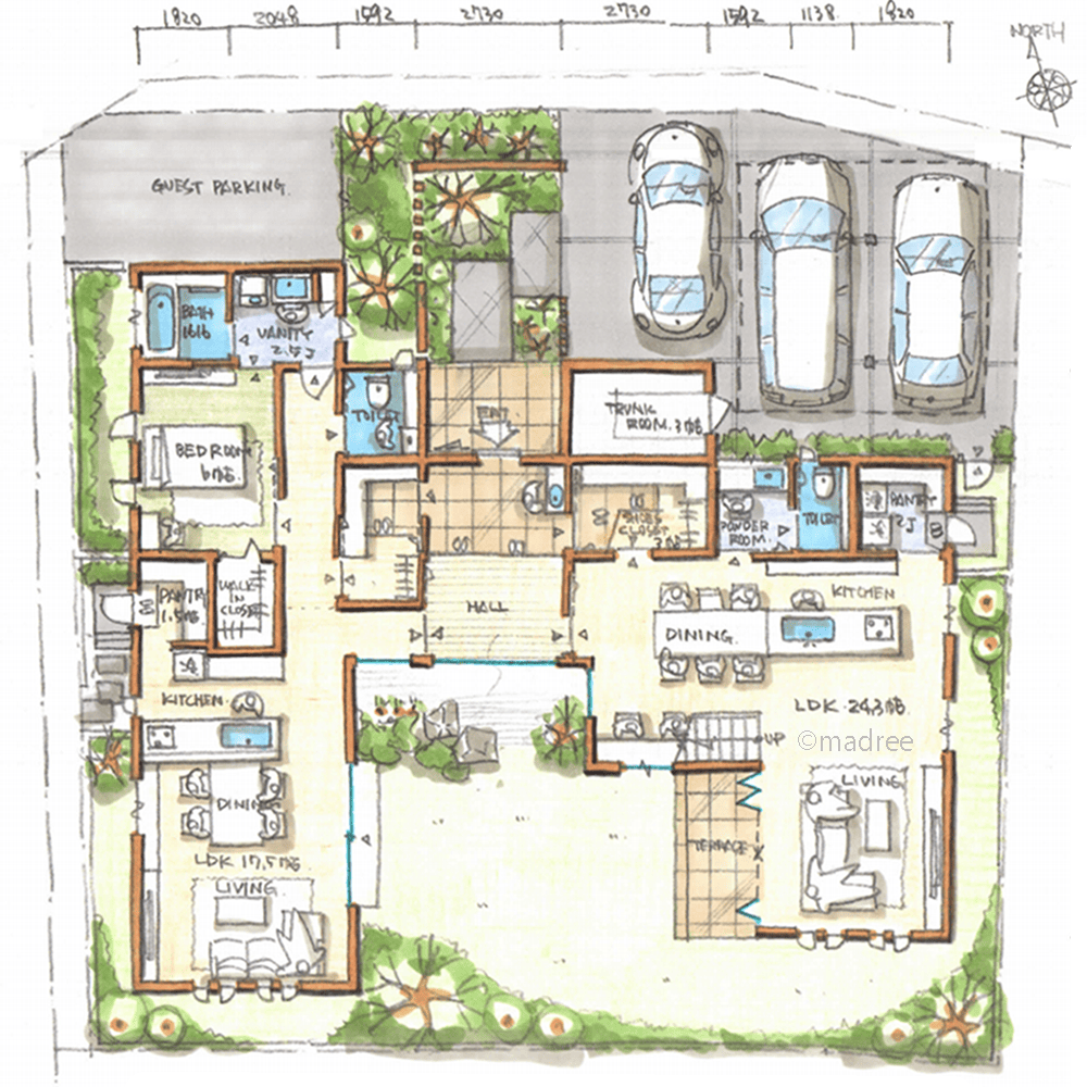 [62坪 1LDK] まわりの視線気にせず家族団らん楽しむ、中庭に開けた明るい二世帯住宅の間取り