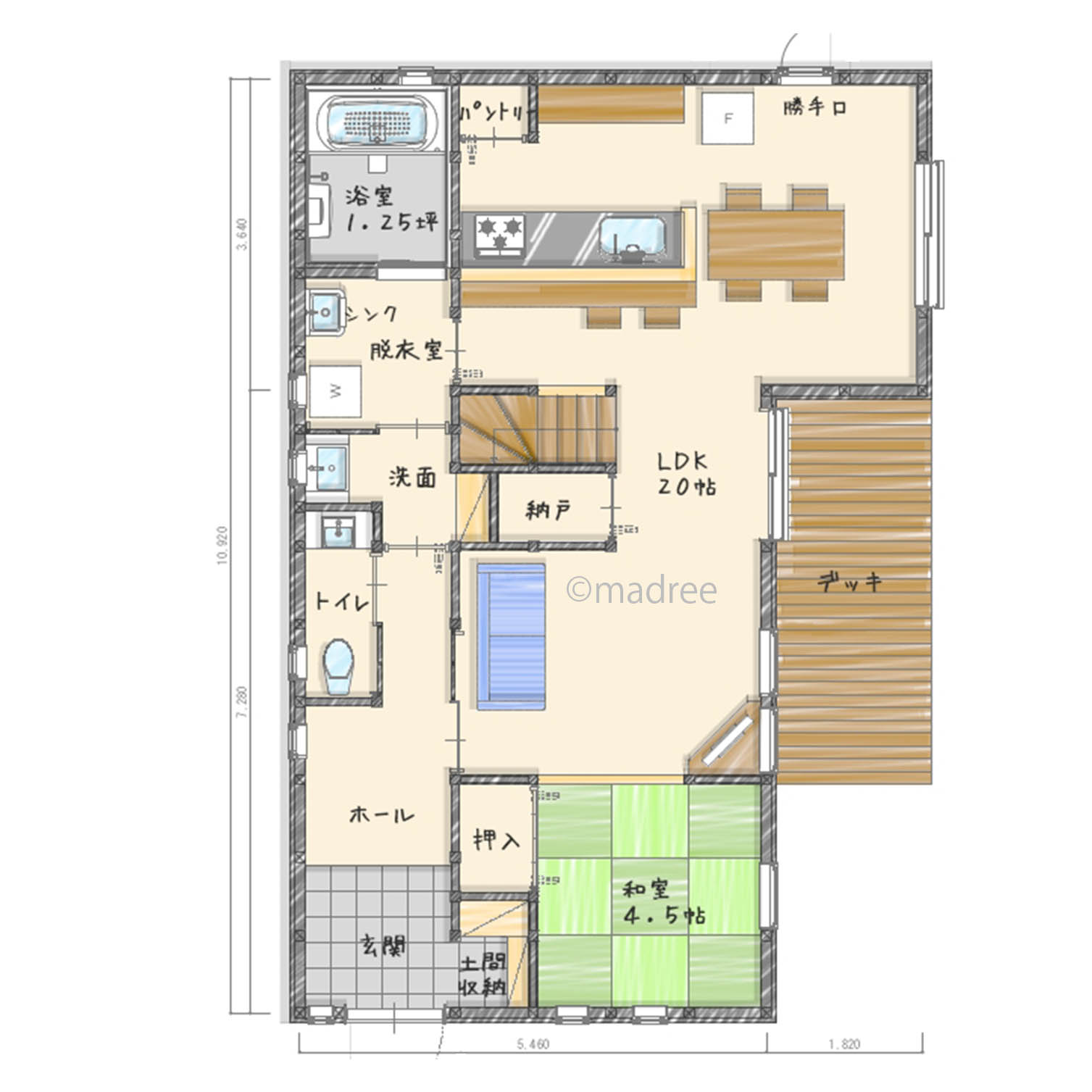全国の建築家から間取りが集まるmadree(マドリー)で集まった38坪、3LDKの間取りです。バルコニーやカウンターキッチンが特徴の注文住宅の間取りです。