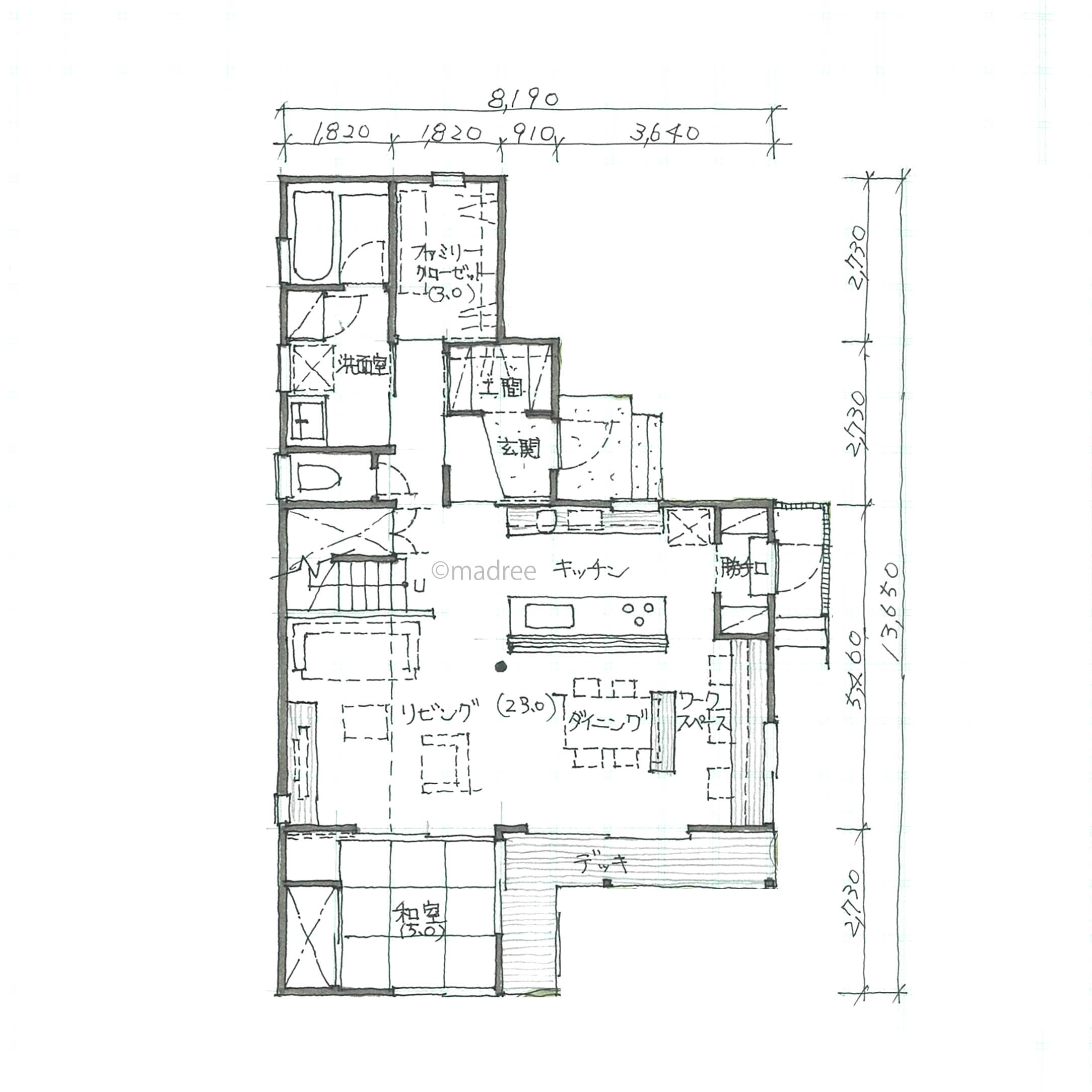全国の建築家から間取りが集まるmadree(マドリー)で集まった35坪、3LDKの間取りです。外とつながるLDKやリビング吹抜が特徴の注文住宅の間取りです。
