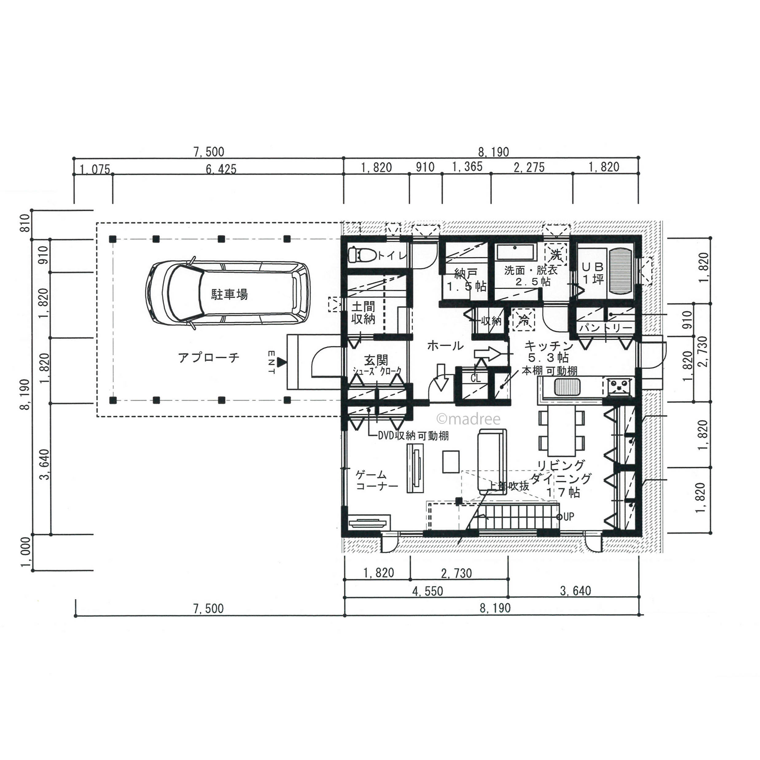 全国の建築家から間取りが集まるmadree(マドリー)で集まった37坪、3LDKの間取りです。リビング吹抜やコンパクトLDKが特徴の注文住宅の間取りです。