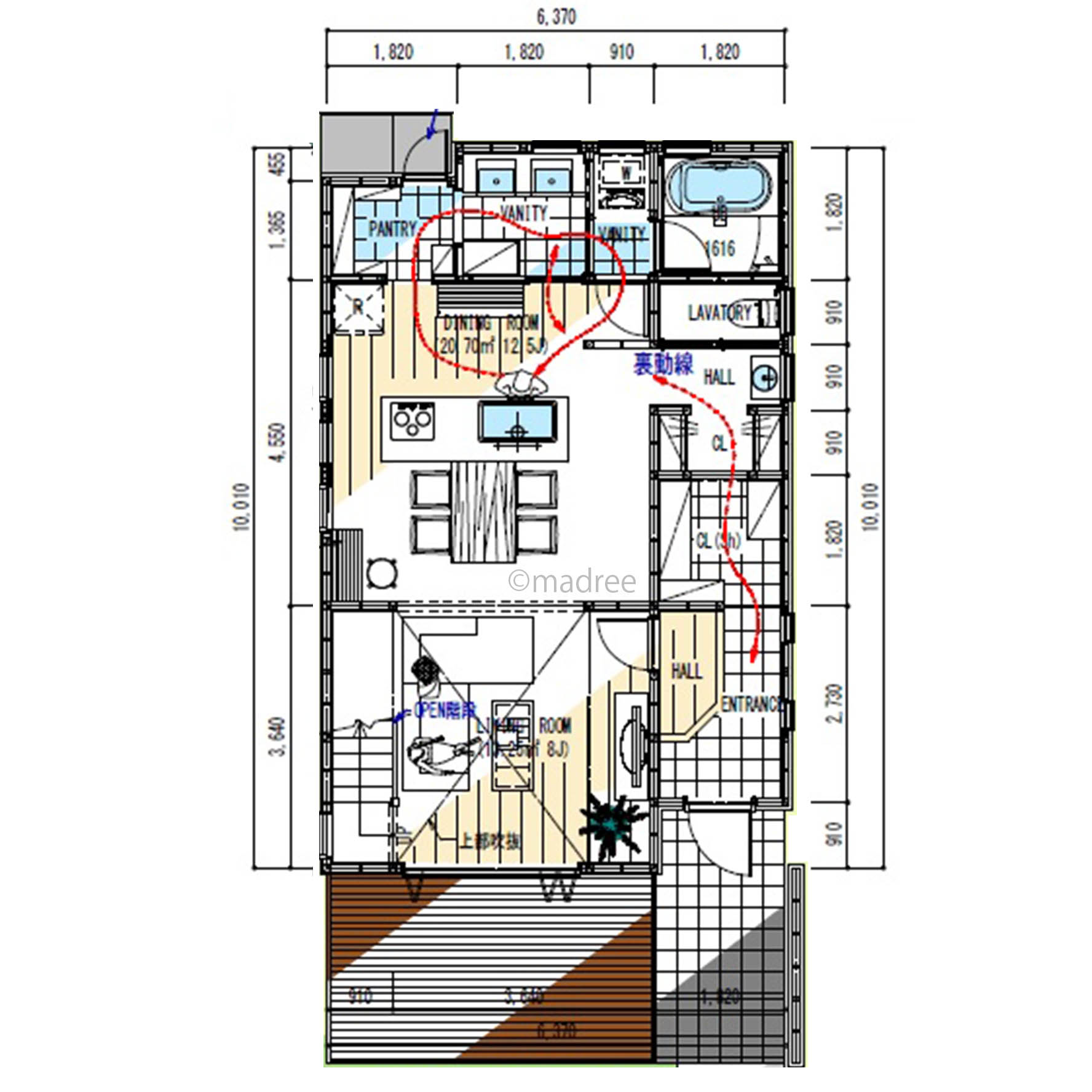全国の建築家から間取りが集まるmadree(マドリー)で集まった33坪、2LDKの間取りです。外とつながるLDKやリビング吹抜が特徴の注文住宅の間取りです。