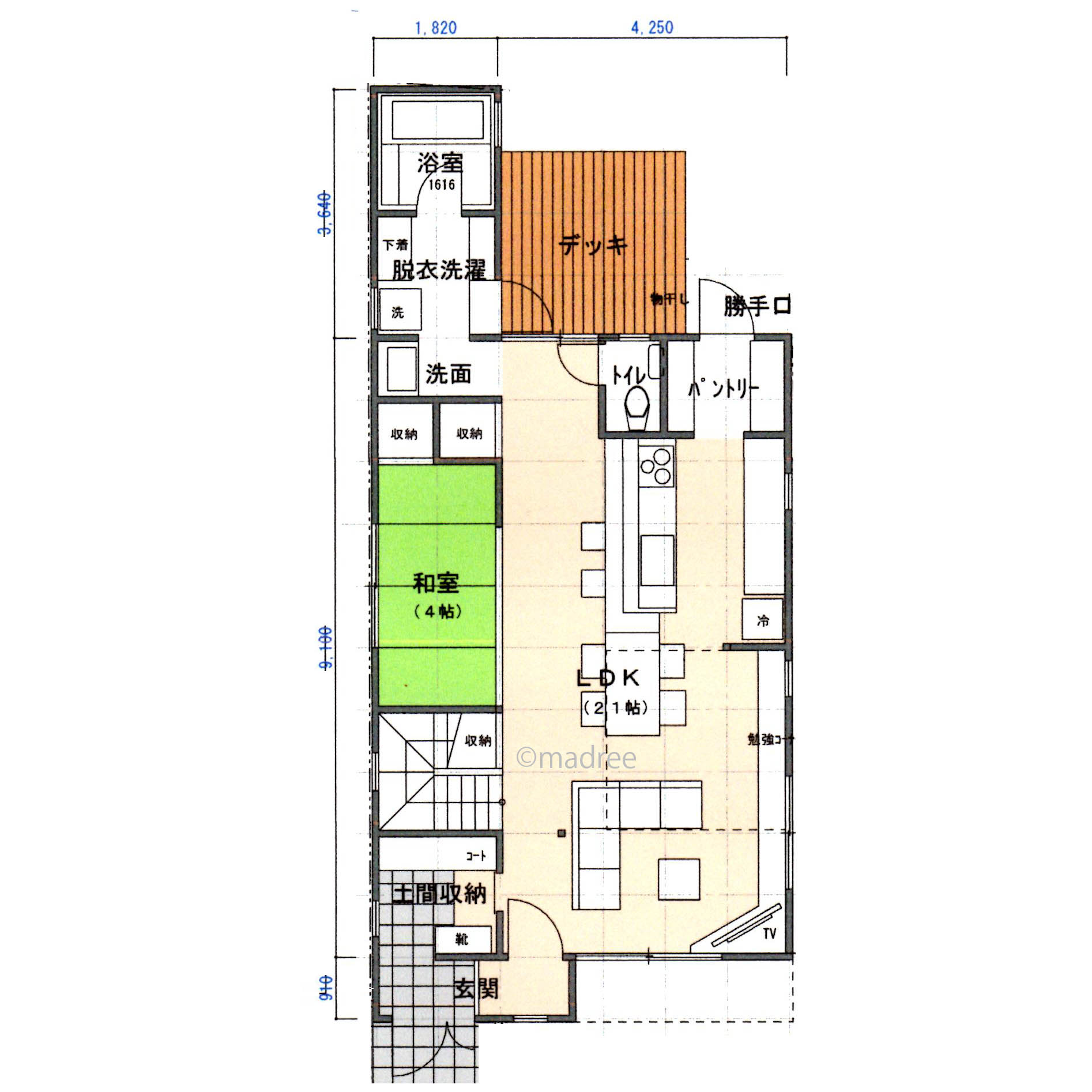 道路に面した駐車スペースを約1m階段で上がるとシンボルツリーの奥に玄関が見え隠れしている。右手の塀のドアは勝手口への出入り口となっている。玄関には土間収納が付いていて天井までの収納家具を備えている。LDKは4.5×9mの矩形のワンルームでLDの一部は吹抜となっている。キッチンとダイニングテーブルは一体となっているがテーブルを離して使用することも可。キッチンの奥はパントリーになっていて勝手口につながる。LDKに面して4帖の和室がありその奥に洗面、脱衣、洗濯、浴室がつづく。洗濯室から北側デッキに出られ屋根付きの物干し場がある。