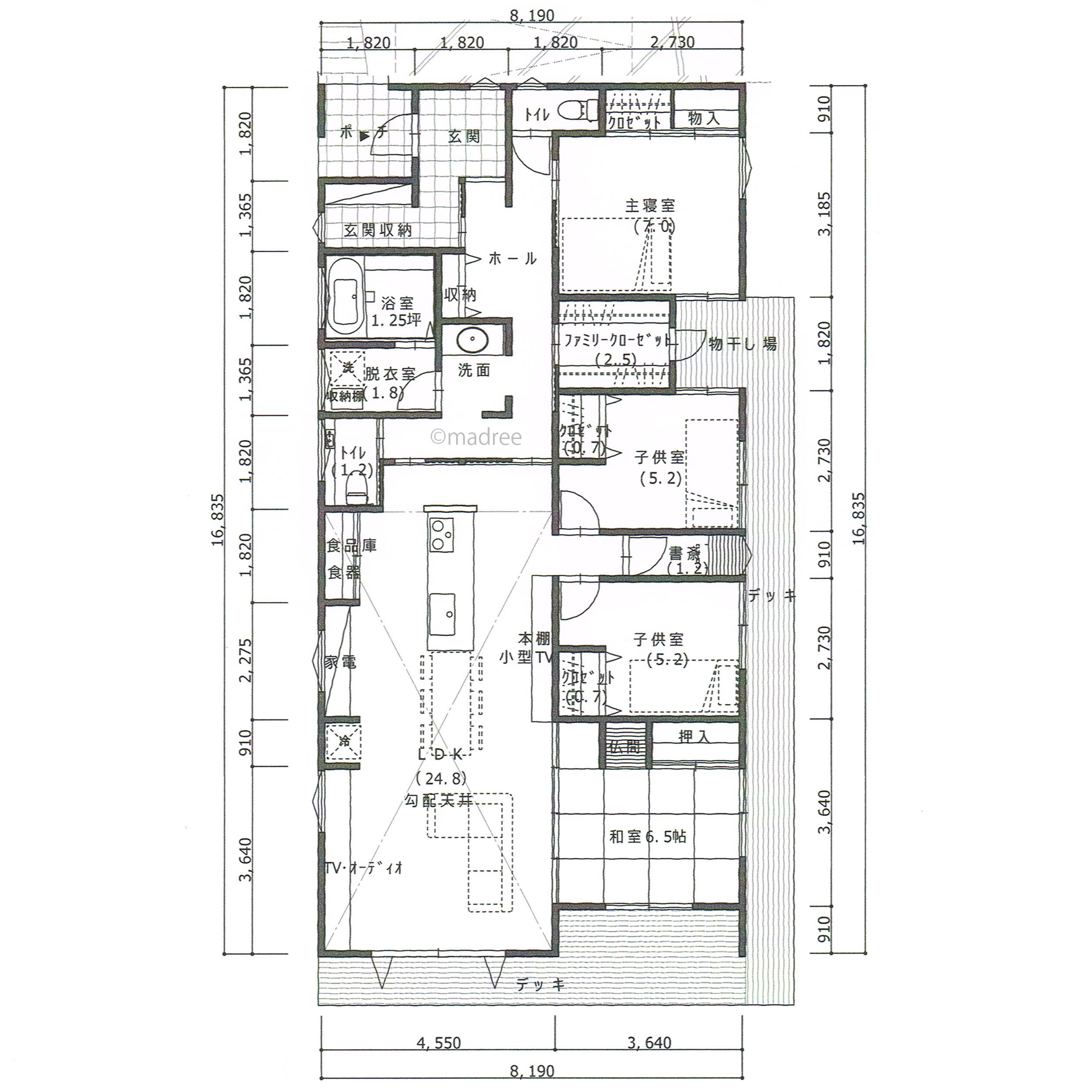 朝日がすべての個室に降り注ぐ、繋がるデッキで子ども達が走り回れる平屋の間取りアイデア