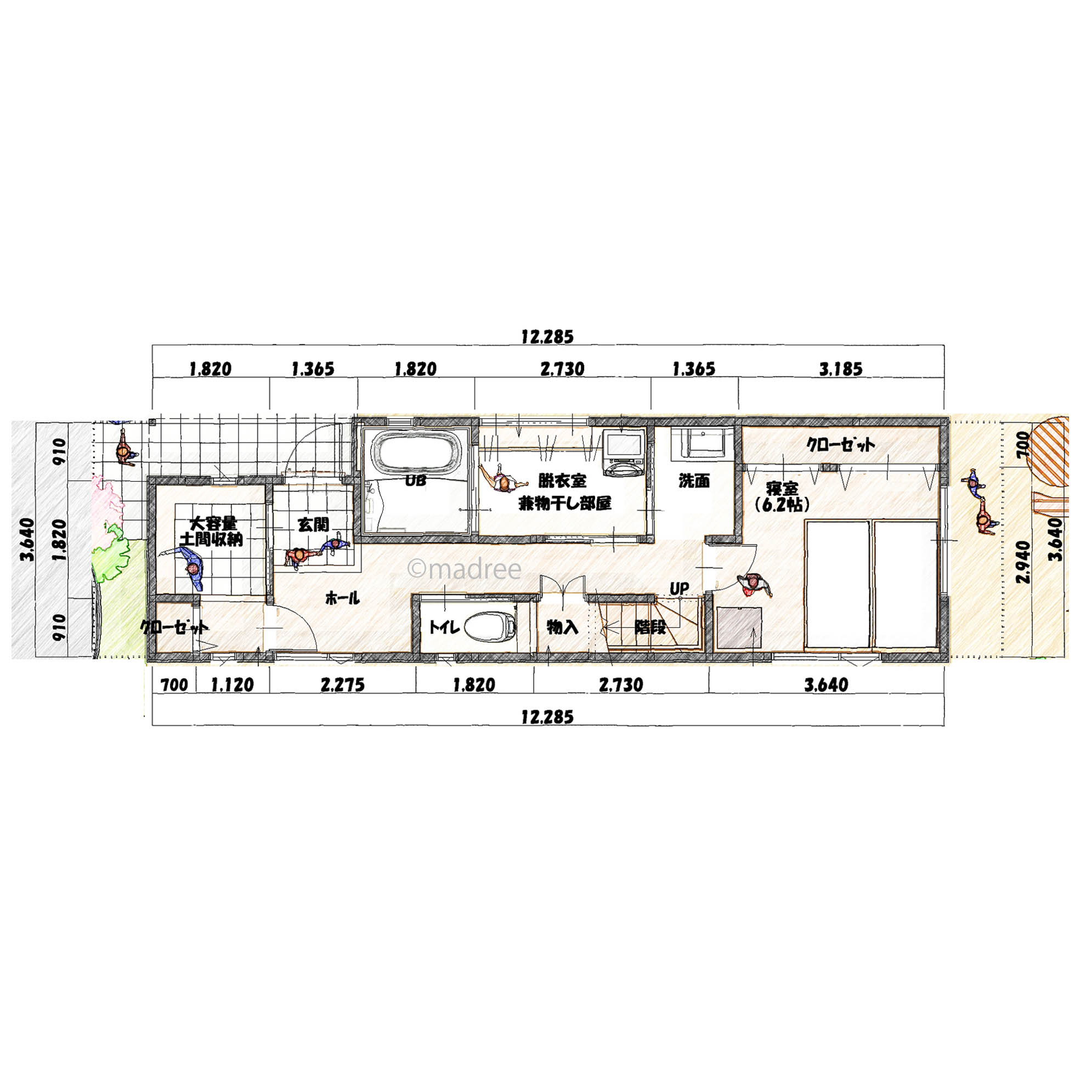 全国の建築家から間取りが集まるmadree(マドリー)で集まった33坪、2LDKの間取りです。L+DKやリビング一体の畳が特徴の注文住宅の間取りです。