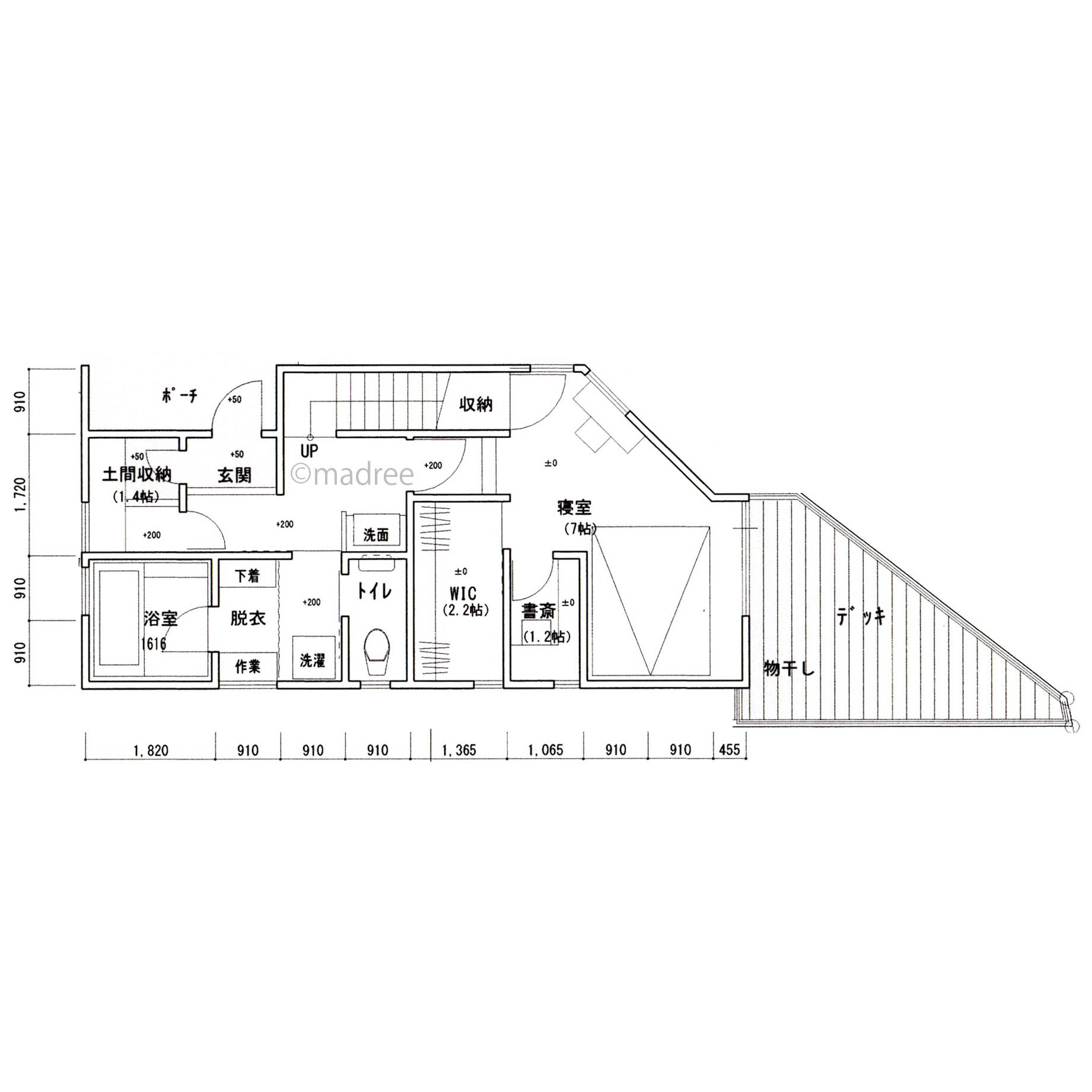 北側道路から建物から入り組んだポーチより玄関にはいります。土間収納があります。浴室、脱衣室、洗濯室、トイレ、と並び、洗面コーナーの奥に寝室の入り口があります。寝室にはWICと書斎があります。寝室の南には塀で囲われたデッキがあり洗濯物はここに干せます。