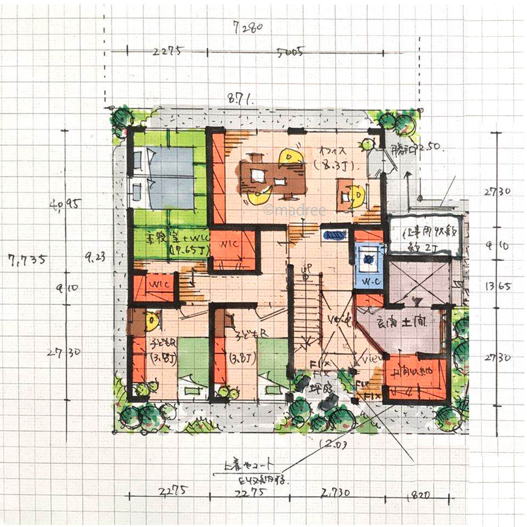 全国の建築家から間取りが集まるmadree(マドリー)で集まった33坪、3LDKの間取りです。オープンキッチンやアイランドキッチンが特徴の注文住宅の間取りです。
