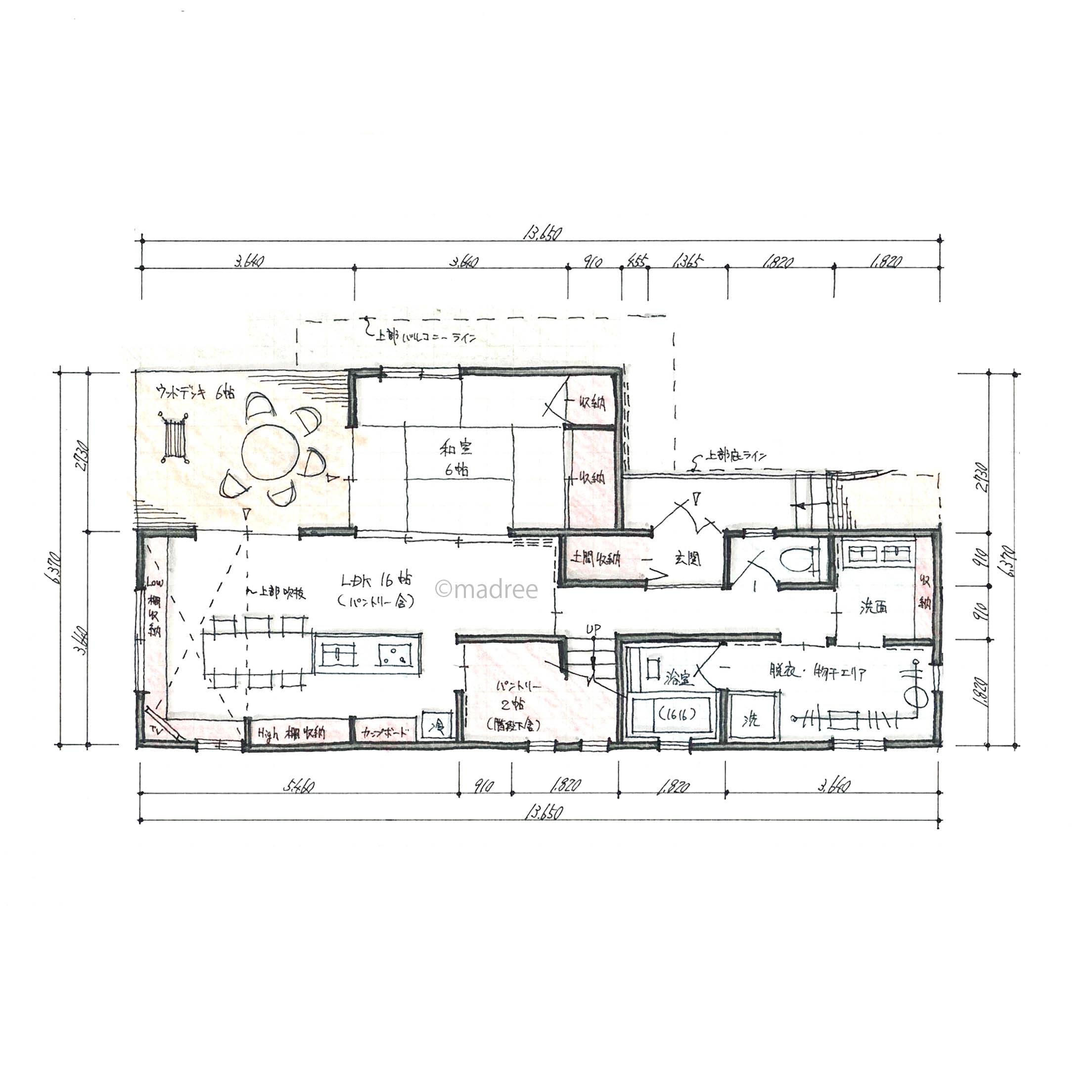 全国の建築家から間取りが集まるmadree(マドリー)で集まった30坪~33坪、4LDKの間取りです。オープンキッチンやアイランドキッチンが特徴の注文住宅の間取りです。