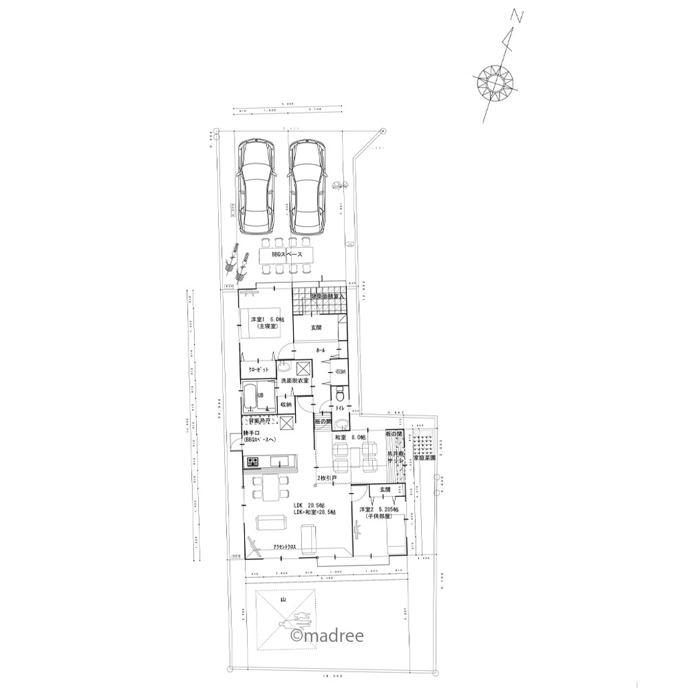 全国の建築家から間取りが集まるmadree(マドリー)で集まった27坪、3LDKの間取りです。外とつながるLDKや広く感じるLDKが特徴の注文住宅の間取りです。