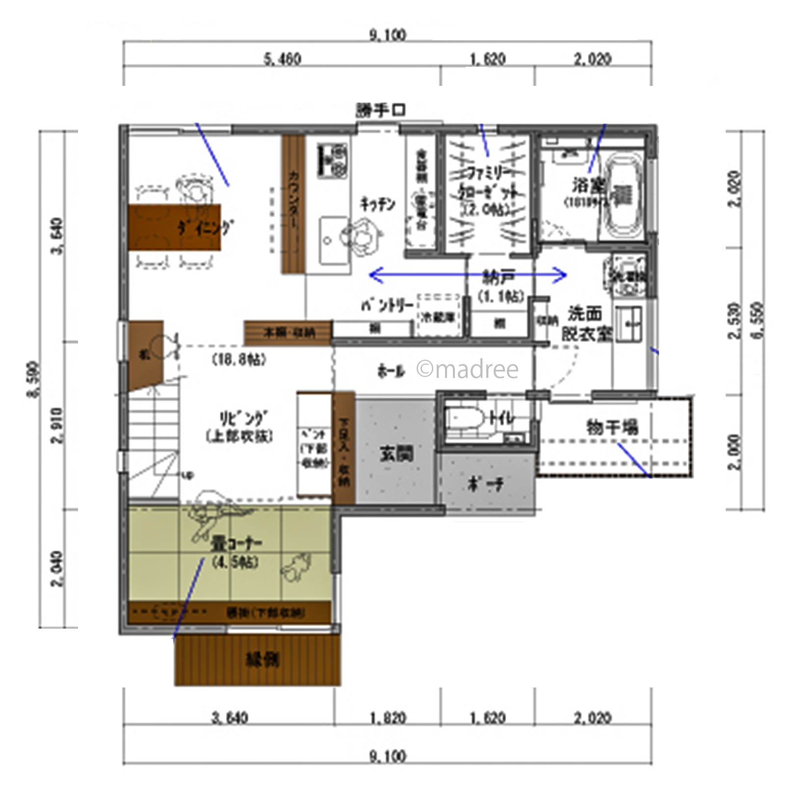 ・家事動線についても、キッチン→ファミリークローゼット→洗面室→物干場がつながるように計画しています。