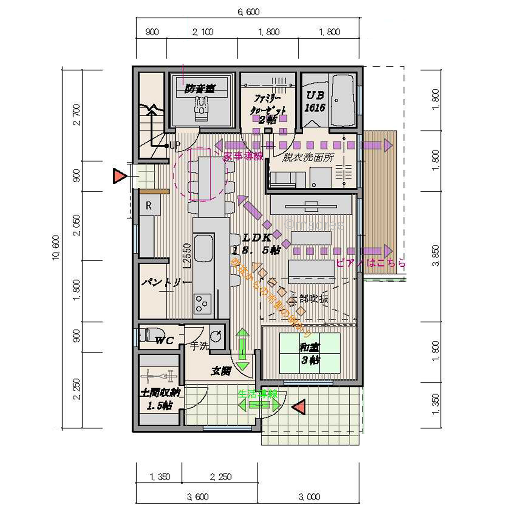 全国の建築家から間取りが集まるmadree(マドリー)で集まった33坪~36坪、2LDKの間取りです。オープンキッチンやペニンシュラキッチンが特徴の注文住宅の間取りです。