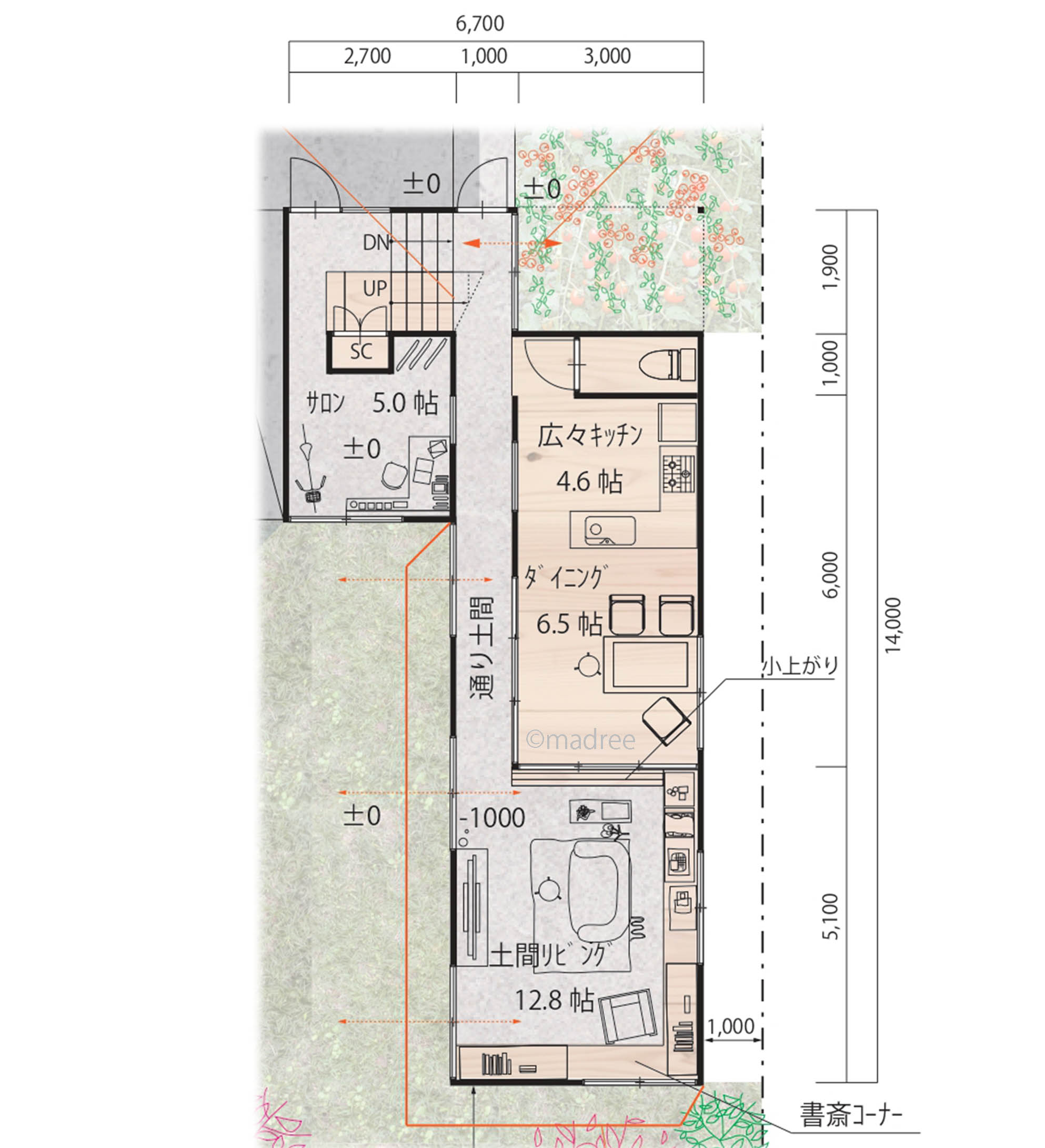 各階に明るさと開放感を届けるだけでなく、1m掘り込むことで目線と同じ高さに家庭菜園や庭を見ることができ、緑との距離が近づき室内に潤いを与えます。