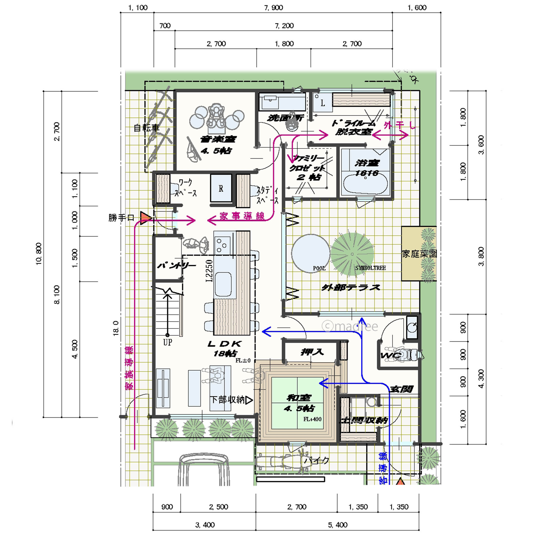 ・家事導線は、勝手口からドライルーム(洗濯)までスムースに行ける経路となっています。