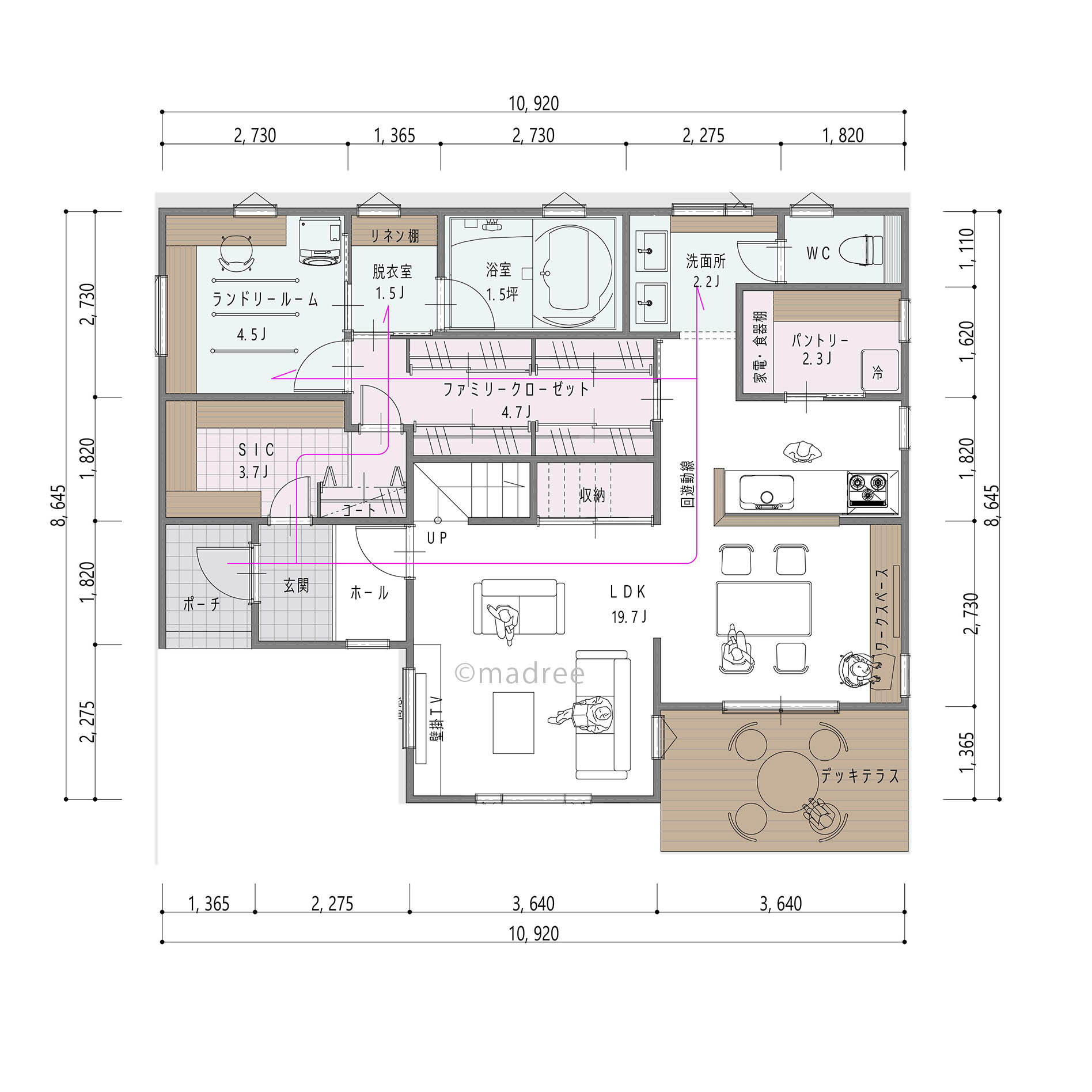 廊下の代わりにウォークスルーのファミクロ!収納充実で家中スッキリ間取り以上に広く感じる家はこのような方におすすめです