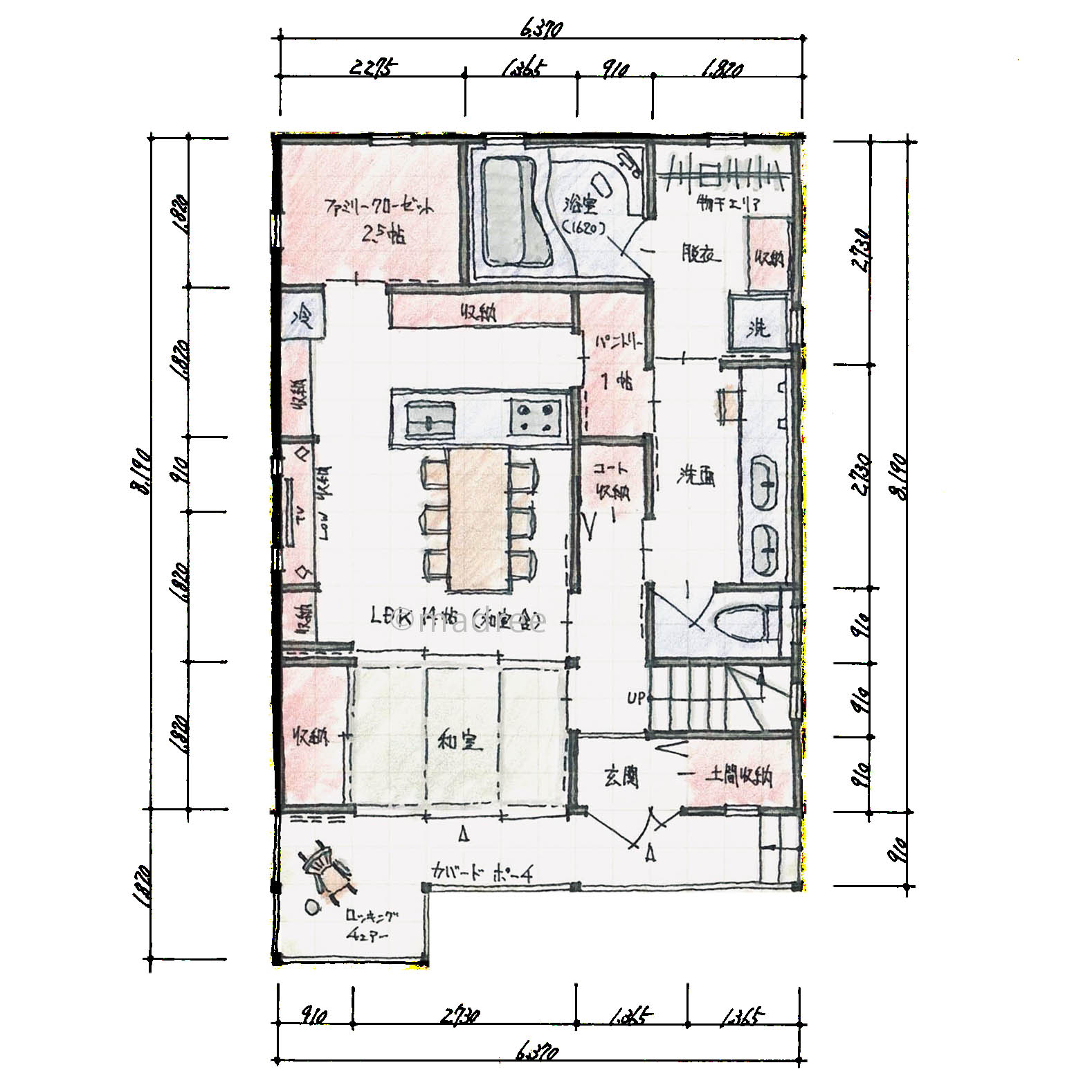 カバードポーチにロッキングチェアでアメリカンな雰囲気の外装と中は落ち着いた和モダンで暮らしが華やぐ家の間取りアイデア
