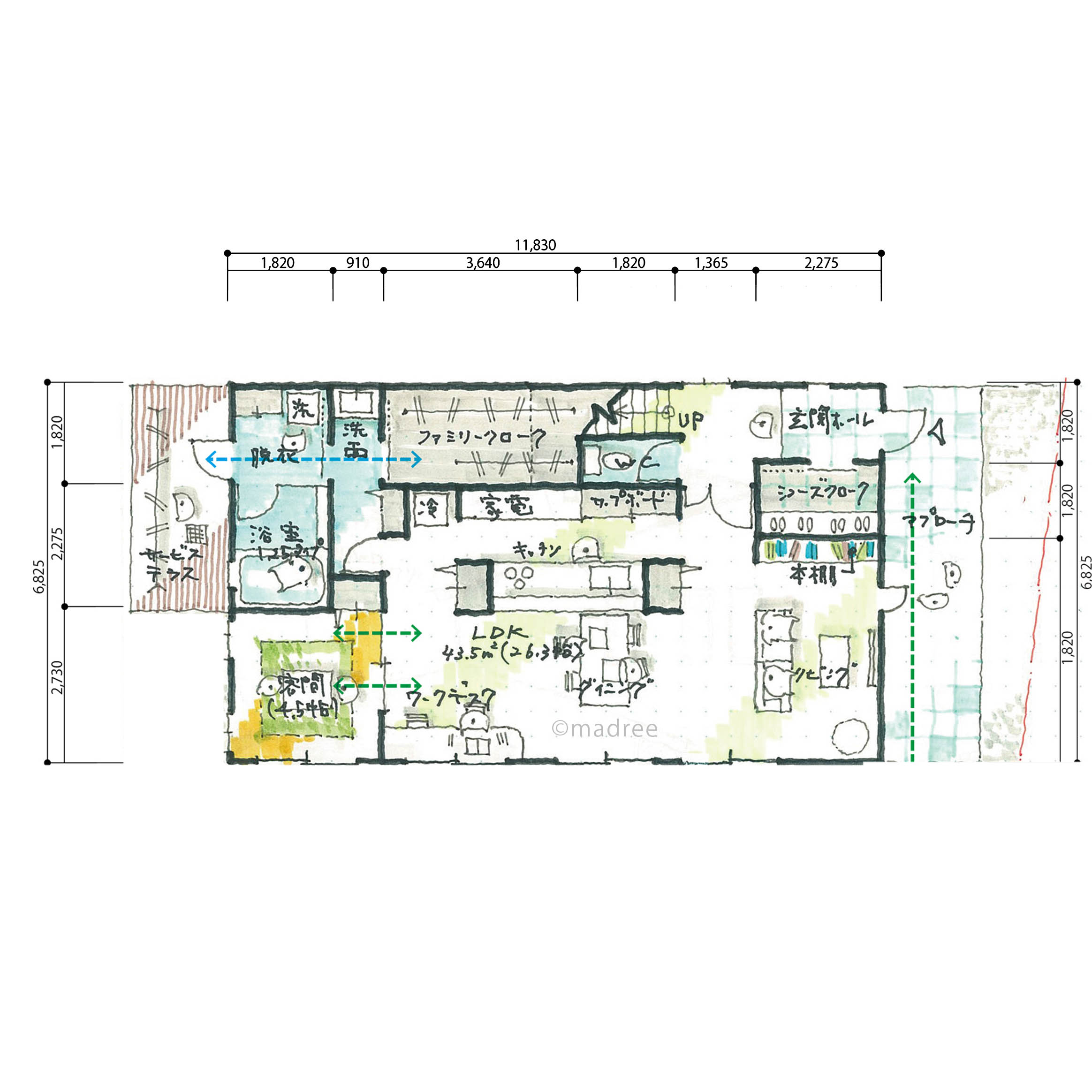 ・水回りとファミリークロークは北西側にまとめ、洗濯・物干し・収納の動線をコンパクトにまとめました。