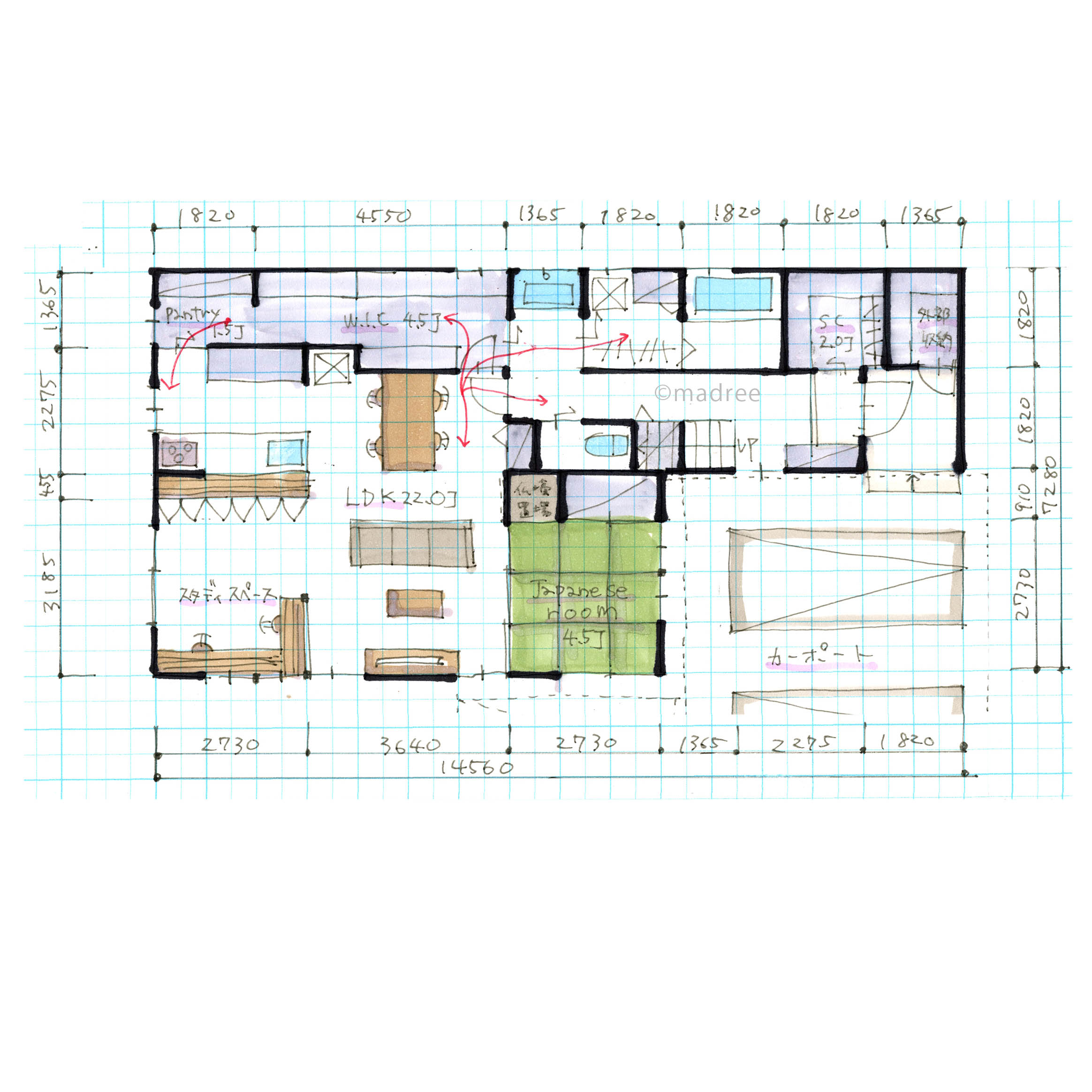 全国の建築家から間取りが集まるmadree(マドリー)で集まった42坪~45坪、4LDKの間取りです。オープンキッチンやペニンシュラキッチンが特徴の注文住宅の間取りです。